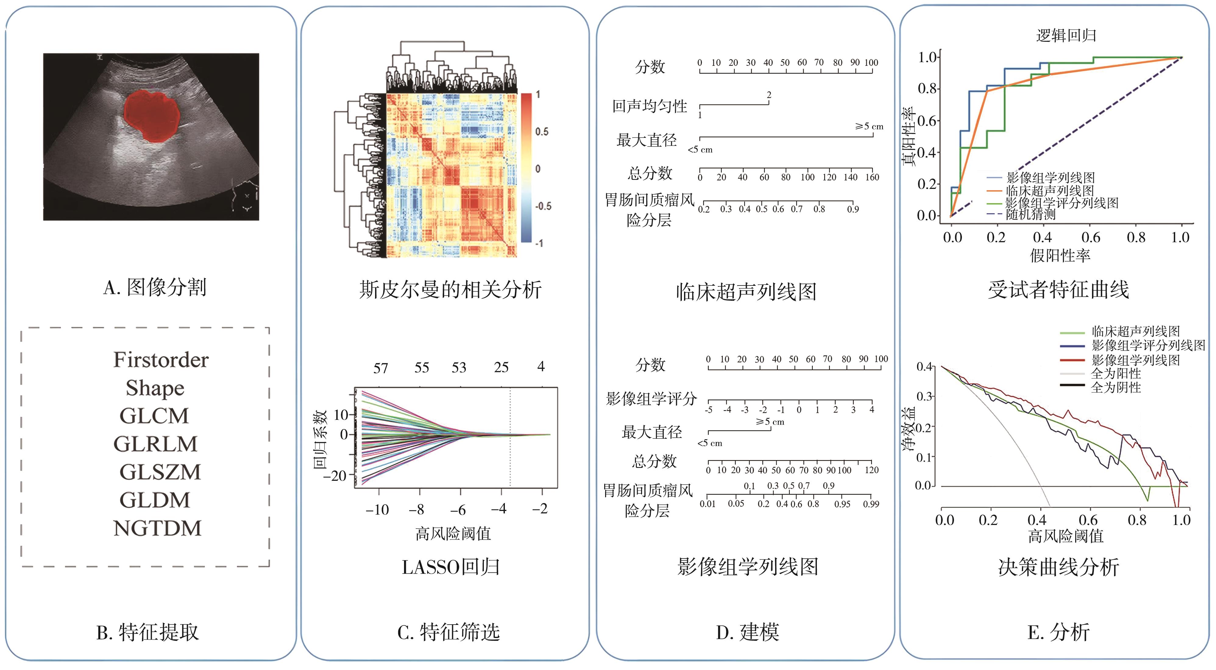 图3),可用于评估GIST的预后。研究发现,将EUS高危特征(如表面溃疡、囊性间隙等)与影像组学相结合,逻辑回归(logistic regression,LR)和SVM模型预测复发风险时优于影像科医生的主观评估(准确率分别为85.2%和69.1%)。