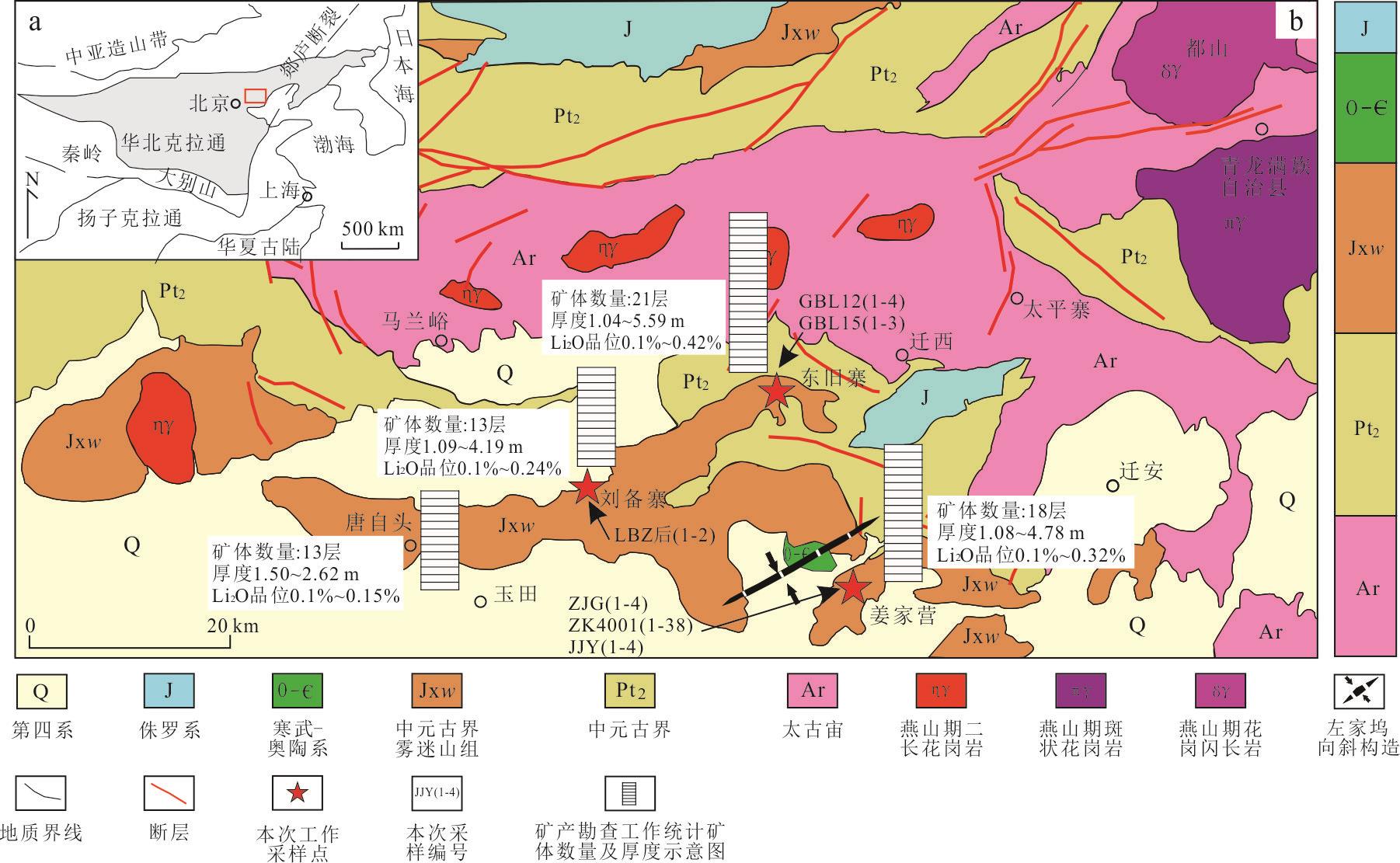2021年项目组在冀东地区发现中元古代富锂沉积岩系,是我国首次在前寒武纪地层中发现的富锂沉积记录.勘查区内共发现33层锂矿体,厚度为1.09~5.59 m,平均厚度2.32 m,Li2O品位为0.1%~0.42%,平均品位0.16%.富锂层位在冀东地区分布广泛、厚度大、层位稳定,因此,可预测的锂资源潜力巨大,具有重要的经济和理论研究价值.该富锂岩系发育于中元古代雾迷山组,XRD矿物分析、地球化学数据显示其主要矿物组成为白云石,其次为石英和伊蒙混层、伊利石等黏土矿物;富锂岩系具有高CaO、MgO含量和低Al2O3含量的特征;浸出实验结果表明,常温常压下富锂泥质白云岩与稀盐酸在封闭容器中反应可发生>77%的锂元素浸出.与华南地区晚古生代的富锂沉积岩系相比,该富锂岩系在成矿时代、赋矿层位、岩石类型、矿物组成、地化特征和赋存状态上存在显著差异,同时也不同于后者需要在加热条件下才发生锂的有效浸出.上述差异可能与以下原因有关:(1)研究区富锂岩系的成矿物质可能来源于山海关古陆的风化;(2)富锂岩系形成于干旱的碳酸盐岩潮坪‒泻湖环境.因此,冀东雾迷山组富锂岩系的形成不同于前人提出的碳酸盐黏土型锂矿,指示了一种新的锂富集机制和成矿过程,但对该套岩系的锂富集成矿机制还需要进一步研究.