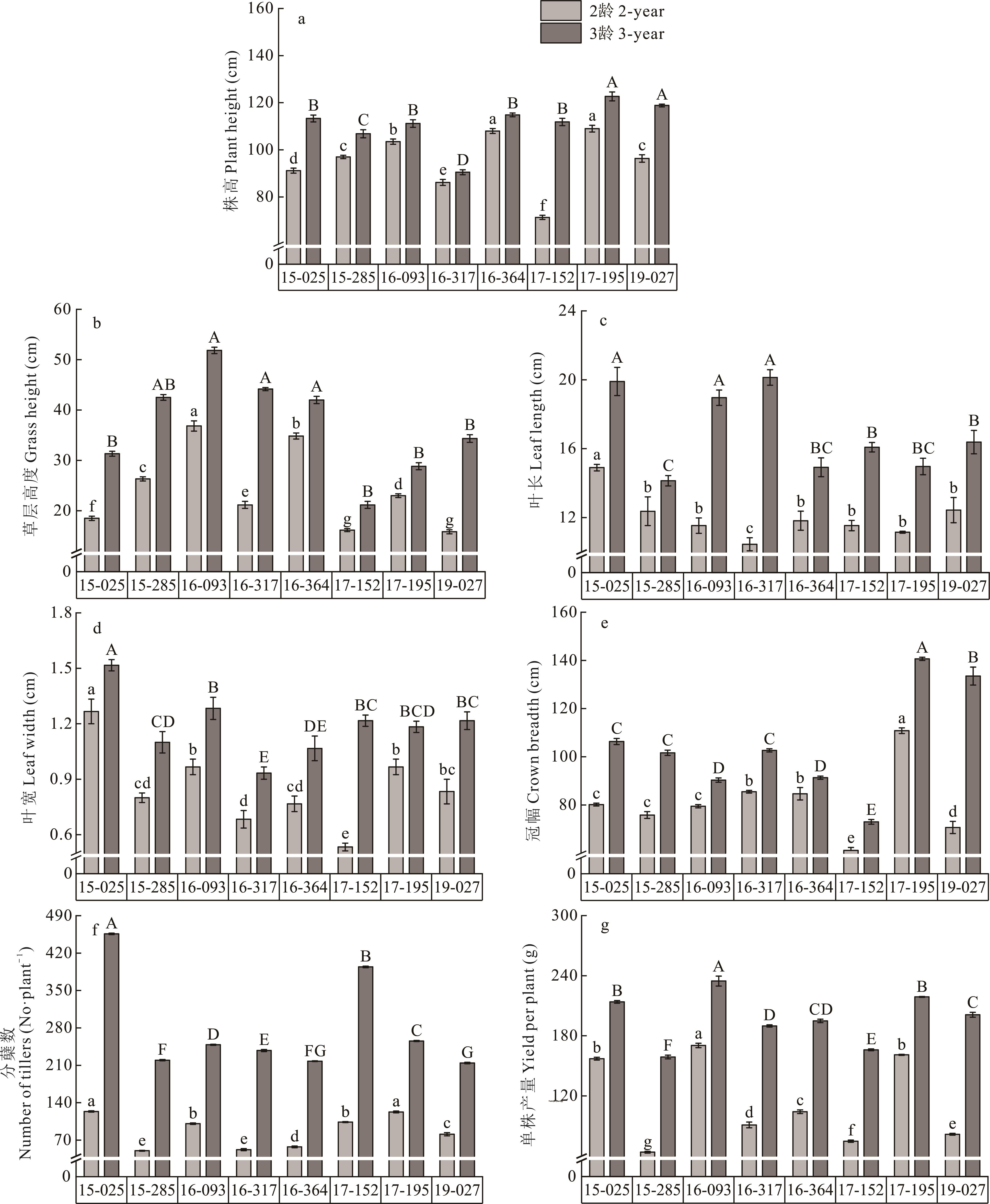 为了综合评价青藏高原区老芒麦资源的特点,本研究在海晏县开展了8份老芒麦资源的农艺性状与生产性能综合评价试验,分析了不同老芒麦资源的农艺性状和产量性状特征,揭示老芒麦饲草产量的影响因素,采用TOPSIS-多准则决策模型对供试老芒麦资源的各项指标进行综合评价,以期筛选出优质的老芒麦资源。结果表明:2龄时,16-364、17-195植株较高,为108.1和109.0 cm;16-093草层高度最高、单株饲草产量最高,分别为36.8 cm,170.3 g;15-025、17-195分蘖数较多,为123和124枝·株-1。3龄时,17-195植株最高、冠幅最大,分别为122.7 cm、140.8 cm;16-093草层高度最高、单株饲草产量最高,分别为51.8 cm,234.7 g;15-025分蘖数最多,为456枝·株-1。结构方程表明,株高和分蘖数是影响老芒麦饲草产量的关键因子,TOPSIS-多准则决策模型综合评价结果表明,16-093饲草生产性能更高、更稳定,是适宜海北州种植的最佳老芒麦资源,可作为下一步品种选育的亲本材料。