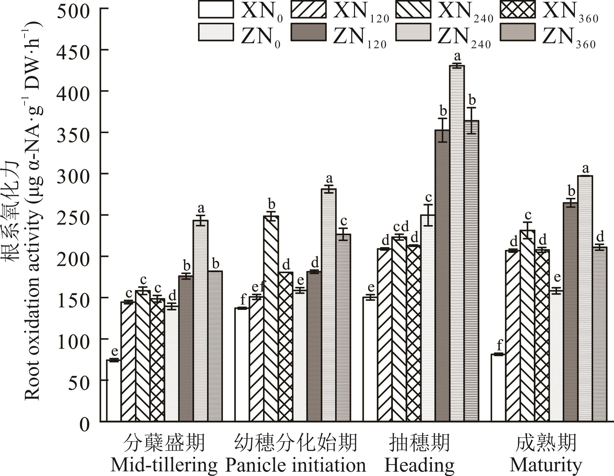 氮肥施用对水稻生长发育及品质形成具有重要影响,为明确施氮对不同食味品质水稻根系生长及分泌有机酸的影响,以郑稻C42(优质食味)和徐稻3号(一般食味)为供试品种进行盆栽试验,设置4个氮肥施用量,分别为0、120、240、360 kg·hm-2(以N0、N120、N240、N360表示),测定水稻根长、根表面积、根系氧化力、根系伤流量、根系伤流液中玉米素和玉米素核苷(Z+ZR)含量、脱落酸含量(ABA)、有机酸总量,为优质食味稻米栽培提供参考。结果表明:随着施氮量的增加,水稻根表面积、根系氧化力、Z+ZR含量、有机酸总量先增加后降低,两品种在N240处各指标达到最高值。与不施氮肥相比,抽穗期徐稻3号在N240时上述指标分别增加了148.0%、48.5%、16.0%与86.5%,郑稻C42在N240时分别增加了103.7%、72.5%、17.8%与98.0%。ABA含量随施氮量增加先降低后增加,在N240处达到最低值。不同食味品种间比较发现,郑稻C42的根系氧化力、根系伤流量、根系伤流液中Z+ZR含量和有机酸总量高于徐稻3号,平均增加40.7%、74.7%、9.7%和34.1%。郑稻C42的根长、根表面积均小于徐稻3号。相关分析可知,根表面积、根系氧化力、根系伤流量、根系伤流液中Z+ZR含量和有机酸总量与直链淀粉含量呈显著或极显著负相关,而与胶稠度呈显著或极显著正相关;幼穗分化始期根系伤流液中ABA含量与直链淀粉含量呈极显著正相关,而与胶稠度呈极显著负相关。综上,N240下不同食味品种根系生长及分泌功能较强。优质食味郑稻C42的根长、根表面积较小,而根系生理活性及根系伤流液中Z+ZR含量与有机酸总量较高。研究结果可以为不同食味水稻栽培及氮肥管理提供理论依据。