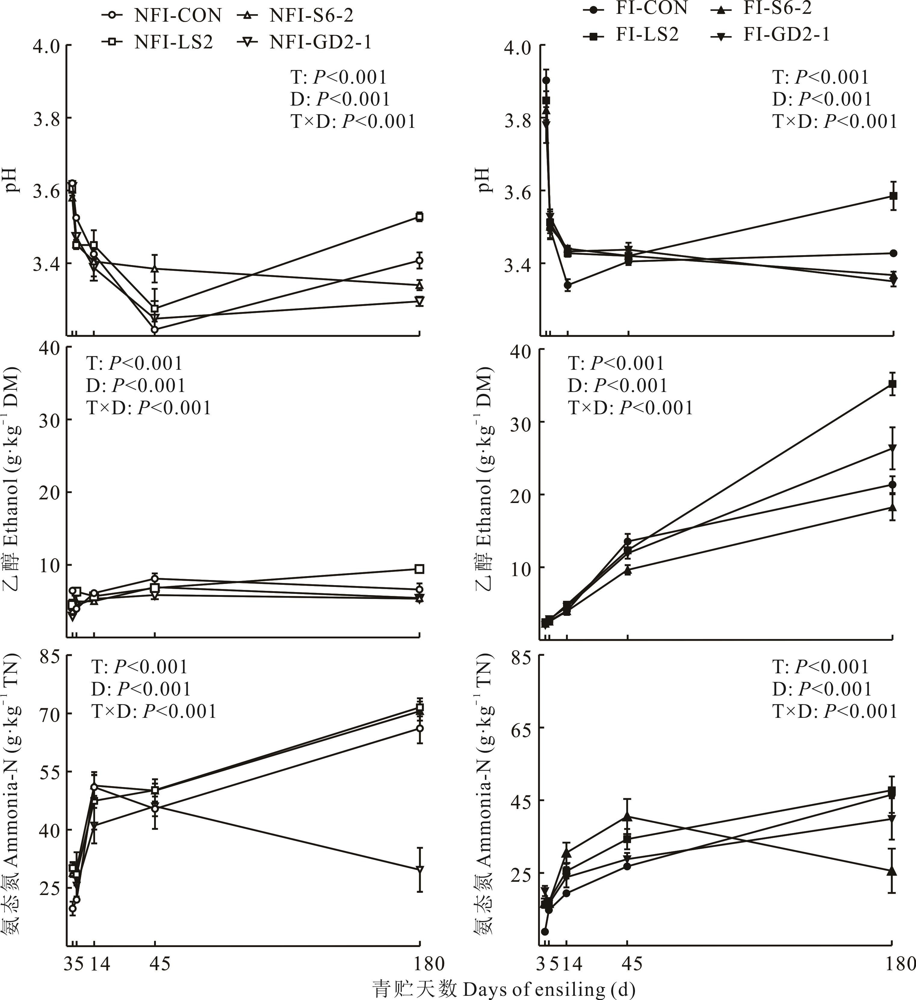 以前期研究筛得的具有潜在抑菌脱毒活性的副干酪乳杆菌LS2、植物乳杆菌S6-2和干酪乳杆菌GD2-1这3株乳酸菌为对象,模拟玉米在田间遭受霉菌侵染,将田间遭受霉菌侵染组(FI)和未侵染组(NFI)玉米进行以下处理:1)自然发酵对照组(CON);2)接种副干酪乳杆菌LS2(LS2);3)接种植物乳杆菌S6-2(S6-2);4)接种干酪乳杆菌GD2-1(GD2-1),于青贮3、5、14、45和180 d后取样,研究乳酸菌对青贮玉米发酵品质和霉菌毒素含量的影响。结果表明,接种GD2-1显著降低了(P<0.05)NFI组氨态氮含量,3株乳酸菌均显著提高了(P<0.05)NFI组水溶性碳水化合物含量。接种S6-2处理显著降低了(P<0.05)FI组氨态氮含量,接种LS2和S6-2处理显著提高了(P<0.05)FI组水溶性碳水化合物含量,接种LS2处理均显示最高的乙酸含量。田间霉菌侵染显著提高了新鲜玉米中呕吐毒素和玉米赤霉烯酮浓度。乳酸菌对霉菌毒素的脱毒效应受到底物浓度影响,各接种剂均未显著影响玉米赤霉烯酮和NFI组呕吐毒素含量,而接种LS2、S6-2和GD2-1处理均显著(P<0.05)降低了FI组全株玉米青贮饲料黄曲霉毒素B1浓度,S6-2处理显著(P<0.05)降低了FI组呕吐毒素浓度。综上所述,接种3株乳酸菌均降低了氨态氮含量,提高了青贮过程中水溶性碳水化合物和乙酸等含量,改善了全株玉米青贮饲料发酵品质,3株乳酸菌均未显著影响青贮饲料玉米赤霉烯酮含量,但均降低了霉菌侵染组全株玉米青贮饲料黄曲霉毒素B1浓度,S6-2还可降低霉菌侵染组全株玉米青贮饲料呕吐毒素浓度。