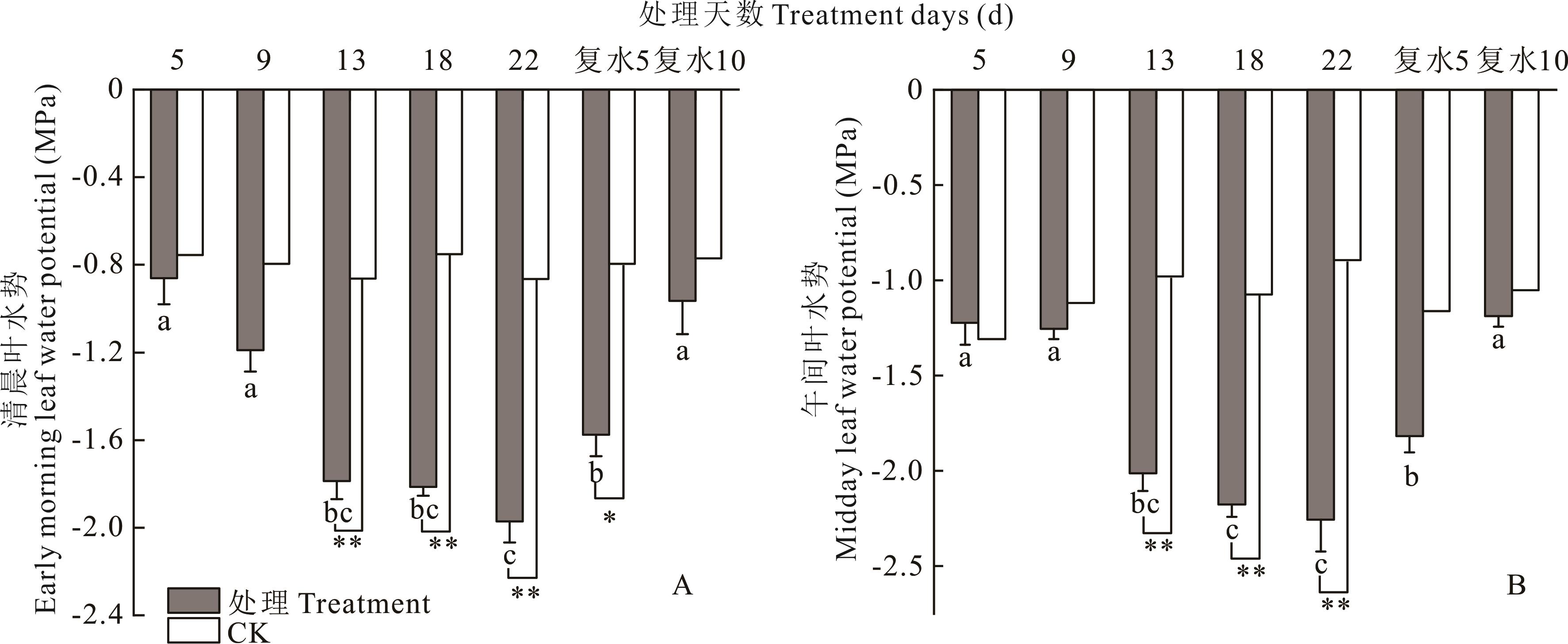 裸果木是亚洲中部荒漠区的特有种,其耐旱耐瘠薄,有较强的抗风固沙能力,是我国重点保护野生植物。本研究以二年生裸果木幼苗为试验材料,设置对照(土壤水分保持在田间持水量的60%~70%)和干旱处理(水分梯度依次设计为田间持水量的40%~50%、30%~40%、20%~30%、10%~20%、5%~10%),开展干旱胁迫及复水试验,测定叶水势、渗透调节物质含量和抗氧化指标,探究干旱胁迫如何影响幼苗叶片的生理特性以及复水后植物的恢复能力,以期为裸果木干旱适应机制的研究及物种保护提供理论依据。结果显示:随干旱胁迫时间的延长,脯氨酸(Pro)、可溶性蛋白(SP)、可溶性糖(SS)、丙二醛(MDA)含量和过氧化物酶(POD)活性均显著上升;超氧化物歧化酶(SOD)活性先上升后下降;过氧化氢酶(CAT)活性、叶水势呈下降趋势。SP含量、SOD和CAT活性在复水第5天时基本恢复至对照水平,其他各指标在复水第10天时基本恢复至对照水平。干旱胁迫下,裸果木幼苗通过主动积累Pro、SP和SS降低渗透势,采取低水势耐受干旱的方式;通过增强SOD和POD酶活性和积累抗坏血酸(AsA)来清除过量的活性氧。复水后,裸果木幼苗具有较强的恢复能力。