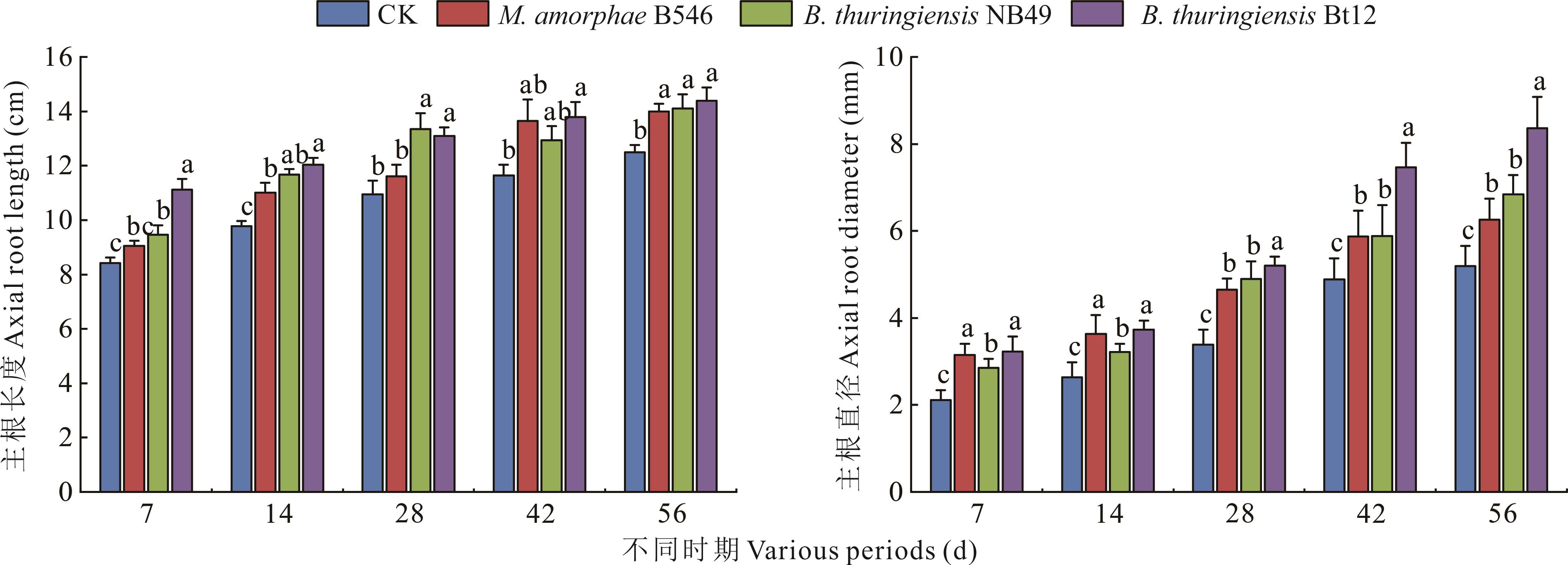 采用盆栽试验研究3株内生细菌对丹参生长、生理及药用品质的影响,为丹参微生物肥料的开发提供备选菌种资源。将从丹参根部分离出的3株内生菌(Mesorhizobium amorphae B546、Bacillus thuringiensis NB49、B. thuringiensis Bt12)对其幼苗进行灌根处理,测定处理后不同时间(7、14、28、42、56 d)的生长和生理指标,并于采收期测定其根内8种活性成分含量。结果表明,3株内生菌均可显著促进丹参生物量的积累,处理56 d后,主根直径、地上及地下部分干重均较对照(CK)显著增加(P<0.05),为CK的1.21~2.49倍。内生菌处理对丹参的生理指标具有显著影响,其中B. thuringiensis Bt12的促进效果最佳,在处理42 d后,可溶性糖、可溶性蛋白、总叶绿素、玉米素(ZT)、6-苄氨基嘌呤(6-BA)和生长素(IAA)为CK 的1.36~2.18倍。3株内生菌对丹参活性成分的积累有不同影响,其中B. thuringiensis Bt12可显著促进总丹参酮及总丹酚酸的积累,含量分别为CK的2.10和1.37倍;M. amorphae B546与B. thuringiensis NB49能促进总丹参酮的积累,含量分别为CK的1.08和1.34倍,但抑制了酚酸类物质的合成,总酚酸含量分别为CK 的92.21%和69.29%。因此,供试的3株丹参内生菌对丹参的生长、生理代谢和活性成分的积累均具有显著影响,其中以B. thuringiensis Bt12的促进效果最为显著,可作为丹参专用微生物肥料开发的备选菌种资源。