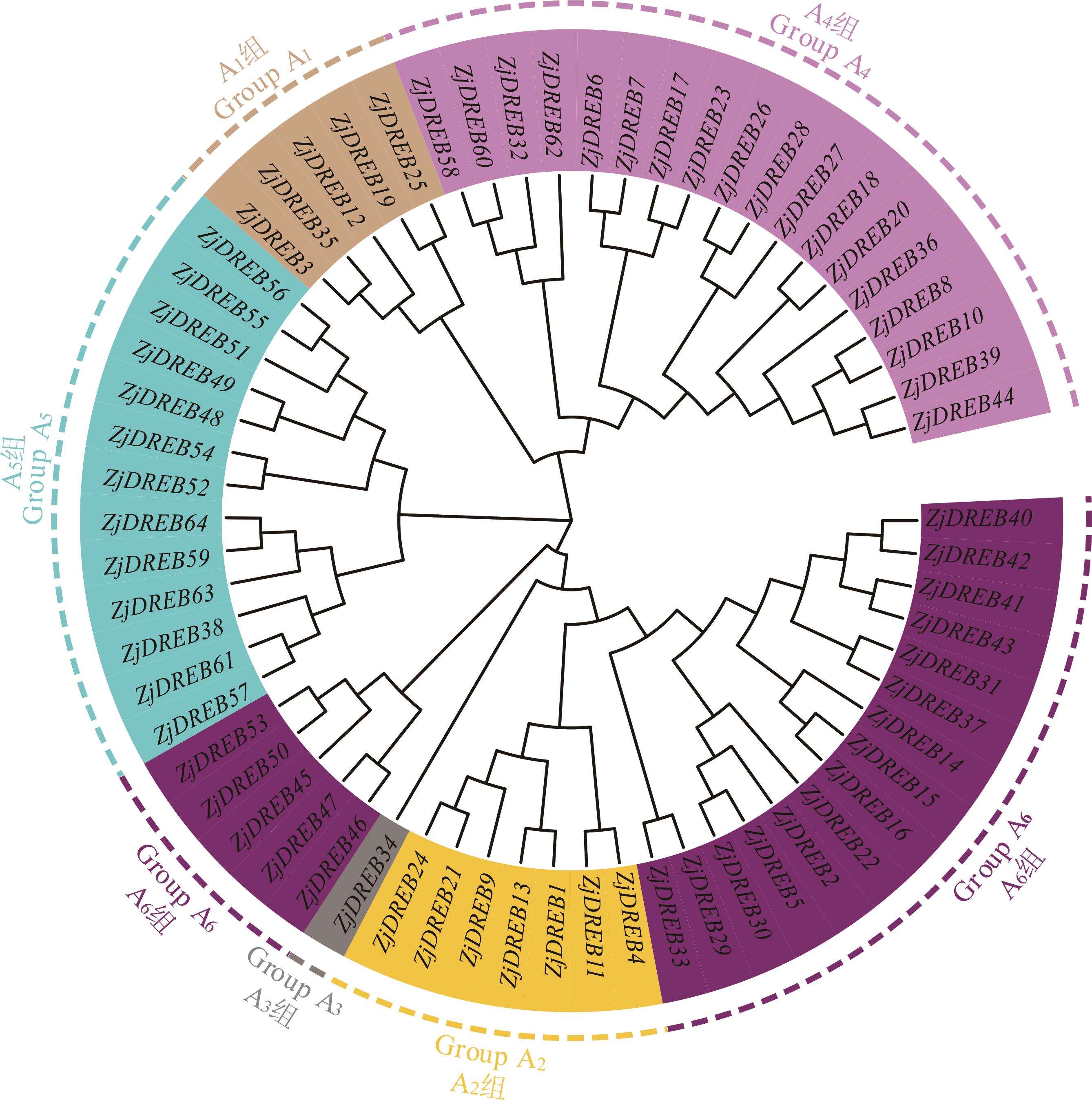 DREB转录因子属于AP2/ERF超家族的一个分支,在植物生长发育以及胁迫应答中发挥至关重要的调控作用。而在我国优良的暖季型草坪草结缕草中关于DREB家族基因的系统分析目前还未见报道。本研究从结缕草全基因组中共鉴定到64个ZjDREB基因,编码的氨基酸为105~984 aa,分子量为11.42~107.04 kDa,理论等电点为4.09~11.95。系统发育分析显示ZjDREB基因分为A1~A6共6组。蛋白序列的保守基序分析表明motif 1、motif 2和motif 3在所有ZjDREB蛋白序列中的分布相对保守,且其中的61个ZjDREB基因在结缕草14条染色体上呈不均匀分布。对ZjDREB基因的共线性分析中共鉴定到3个片段重复基因对,且基因对的非同义替代与同义替代的比值(Ka/Ks)均小于1,表明其在基因扩张中受纯化选择。顺式作用元件分析显示ZjDREB A1和A2组基因启动子区域含有多个与植物激素和非生物胁迫相关的作用元件。利用qRT-PCR对A1和A2组基因在低温、脱落酸、干旱和盐胁迫下的表达模式进行分析,结果显示A1组基因在低温和脱落酸胁迫处理后上调表达,其中ZjDREB3上调幅度最大;A2组基因在干旱和高盐胁迫后表现出不同的表达模式,其中ZjDREB4的上调幅度最大。本研究结果为进一步探究结缕草ZjDREB基因的功能奠定了基础,也为结缕草的遗传改良提供了新的线索。