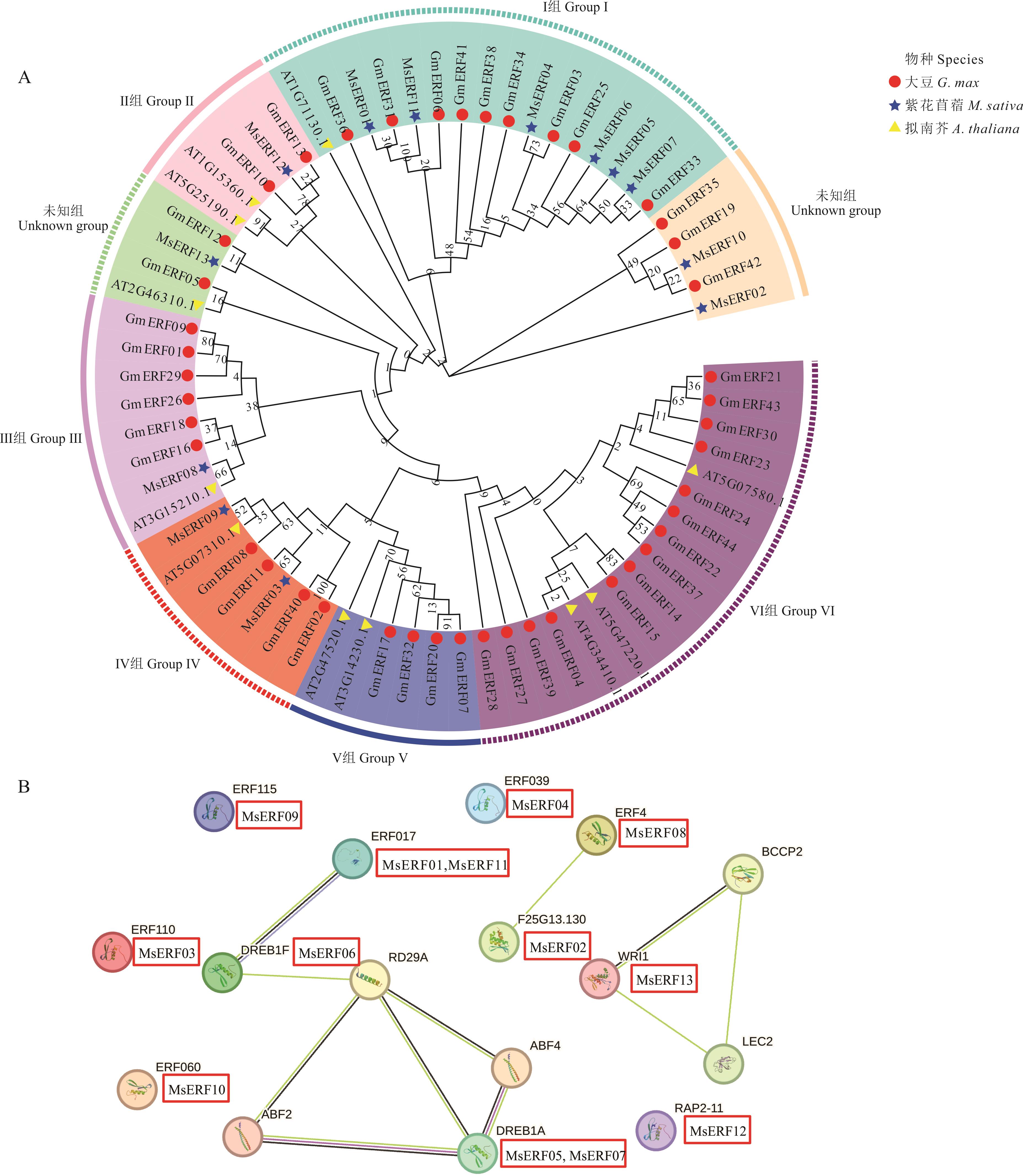 紫花苜蓿是世界上种植最广泛的饲用豆科作物。APETALA2/ethylene-responsive factor(AP2/ERF)转录因子在植物抵御非生物胁迫中起着关键作用。一氧化氮(nitric oxide,NO)作为植物体内的一种信号分子,在植物抗旱中扮演重要角色。本研究利用生物信息学方法对紫花苜蓿MsAP2/ERF基因家族成员进行鉴定及其对NO和干旱的响应模式分析,并从MsAP2/ERF基因家族中筛选到强烈响应NO调控的MsERF07基因进行亚细胞定位。结果表明,该家族成员均含有AP2结构域,其蛋白质的氨基酸数目介于176~422;亚细胞定位预测大部分蛋白都定位在细胞核; MsERF01和MsERF11的亲缘关系较近,并且它们具有相似的结构域;61.54%的MsAP2/ERF基因只含有外显子,也具有高度相似的保守基序;蛋白互作显示MsERF01和MsERF11、MsERF05和MsERF07均处于蛋白互作图中的同一节点;13个MsAP2/ERF基因家族成员被不均匀分布在13条染色体上,MsAP2/ERF基因家族成员的启动子序列中有43个与光反应、组织特异性表达、胁迫以及植物激素相关的顺式调控元件。此外,紫花苜蓿的转录组测序数据分析表明大部分MsAP2/ERF基因家族成员在NO的调控下表达量增加,进一步qRT-RCR试验结果显示,外源NO促进了干旱胁迫下MsAP2/ERF基因的表达量。克隆MsERF07基因,亚细胞定位结果显示该蛋白定位在细胞核与细胞膜中,本研究为后续研究紫花苜蓿MsERF07基因响应干旱胁迫的分子机制提供了基础。