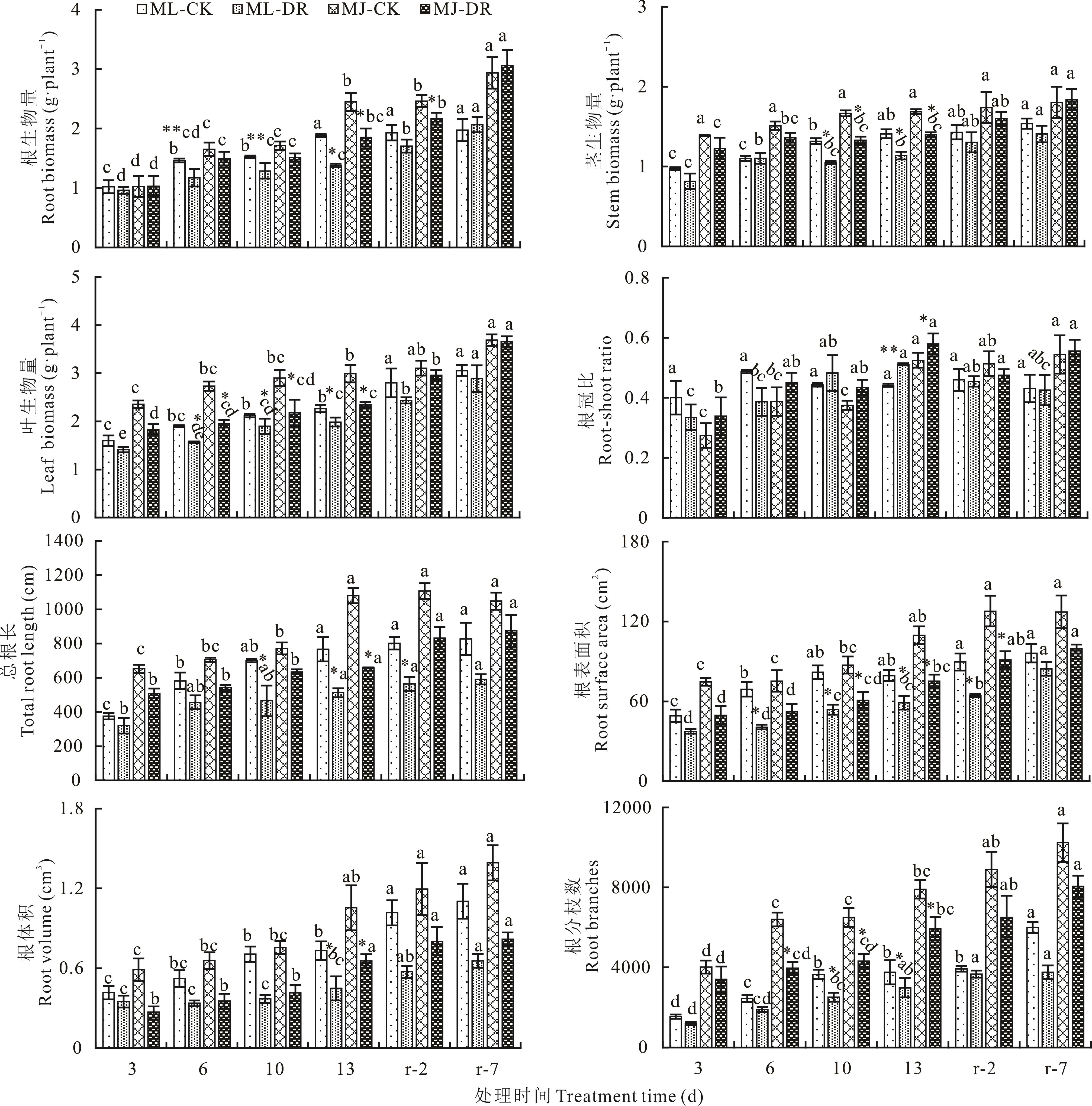 植物在遭受干旱胁迫后复水,会经历应激适应、伤害、修复过程,且不同植物对水分亏缺的敏感性不同,复水后的恢复效应也存在差异。因此,研究植物耐旱性与复水后的恢复效应对植物抗旱节水育种具有重要意义。本研究采用盆栽控水模拟干旱胁迫和复水处理,以野生型和栽培型河北木蓝为对象,在持续干旱胁迫3、6、10和13 d以及复水2和7 d后进行生长及生理生化指标测定,研究干旱胁迫和复水条件下2种木蓝的生物量分配策略和响应干旱的渗透调节生理机制及其种内差异。结果表明:1)随干旱持续时间的延长,2种木蓝器官生物量、根系分布特征(总根长、根表面积、根体积、根分枝数)、淀粉含量以及根-中性转化酶(neutral invertase, NIV)活性逐渐降低;而根冠比、脯氨酸(Pro)含量、丙二醛(MDA)含量、蔗糖含量、蔗糖合酶(sucrose synthase, SUS)活性、α-淀粉酶(α-amylase, α-AL)活性、叶-NIV活性均逐渐增加。2)复水处理7 d后,除了根系分布特征和MDA含量外,其他指标均恢复至对照水平,均具有补偿生长能力。3)基于各指标的主成分分析结果,相比之下,栽培型木蓝各指标变化幅度均显著大于野生型,对干旱胁迫具有更强的耐受性。由此可见,2种木蓝在干旱胁迫下积累渗透调节物质,以此维持细胞膨压,缓解细胞膜受损,并调控蔗糖和淀粉代谢酶活性,进而使生物量分配倾向于根系,为促进根系对水分吸收而提供能量,复水后二者均具有显著的补偿效应。