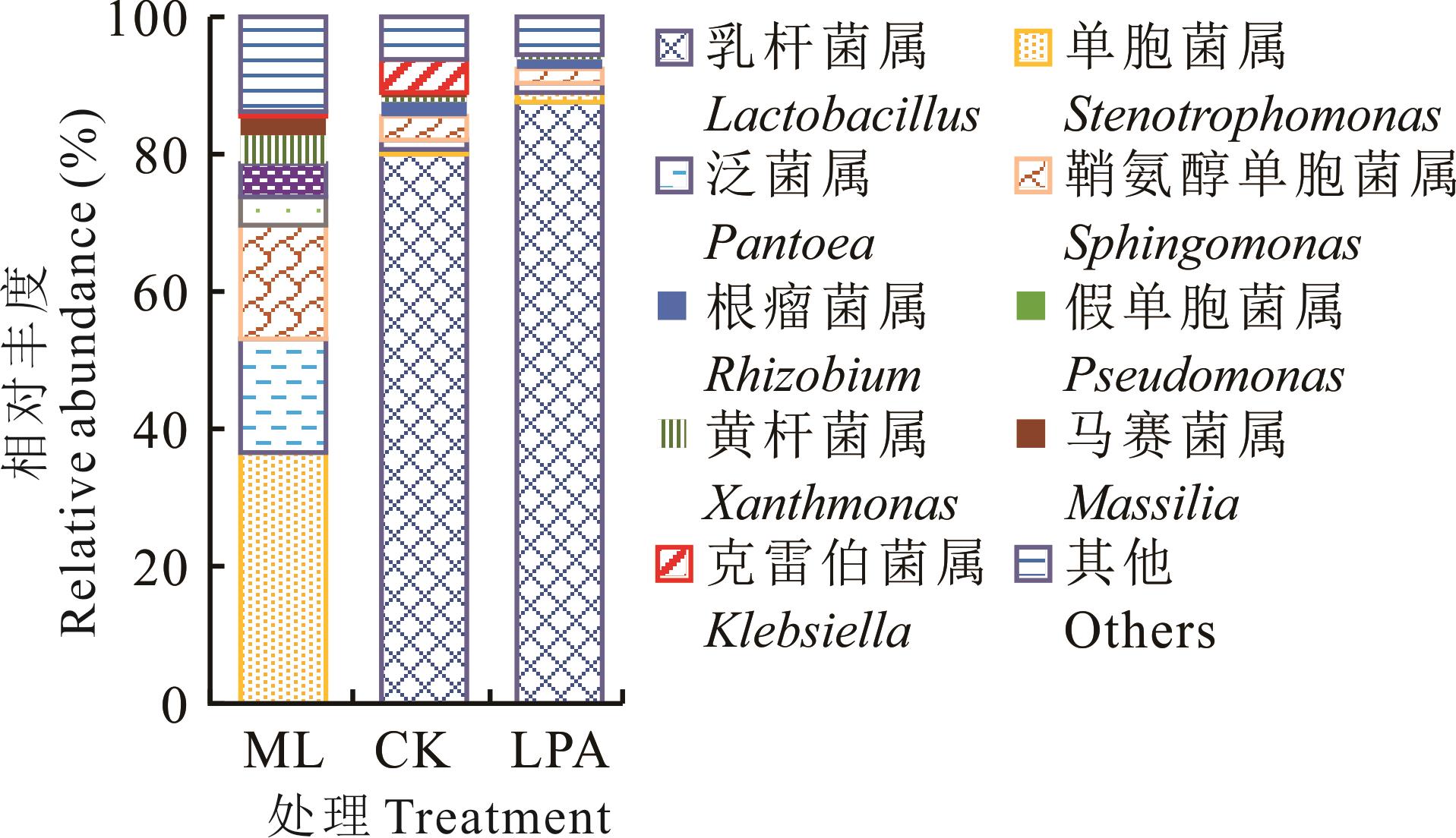 饲料气味在动物采食喜好、采食量以及生产性能方面起着重要作用,然而目前关于饲料中气味特征的研究极为有限。本研究采用顶空-气相色谱-质谱法和高通量测序技术,分析了添加(LPA组)和不添加(CK组)植物乳杆菌接种剂对柑桔劣果和玉米秸混合青贮饲料发酵品质、细菌菌群结构和挥发性化合物的影响。结果表明,相较于CK组,LPA组显著降低了青贮pH、乙酸和氨态氮含量(P<0.05),显著提高了乳酸含量(P<0.05)。乳杆菌属是青贮中的优势属,LPA组乳杆菌属相对丰度更高,克雷伯菌属相对丰度更低。碳水化合物代谢是青贮中最主要的代谢类型,CK组较LPA组降低了果糖和甘露糖代谢以及淀粉和蔗糖代谢类基因的相对丰度。D-柠檬烯是青贮中含量最丰富的萜烯类化合物,CK组增加了酸类和醇类化合物含量,降低了D-柠檬烯含量。克雷伯菌属的相对丰度与乙酸和乙醇的相对含量呈极显著正相关(P<0.01)。综上所述,添加植物乳杆菌能够促进乳杆菌属繁殖,保留更多D-柠檬烯,改善柑桔青贮饲料的发酵品质与香味组成。
