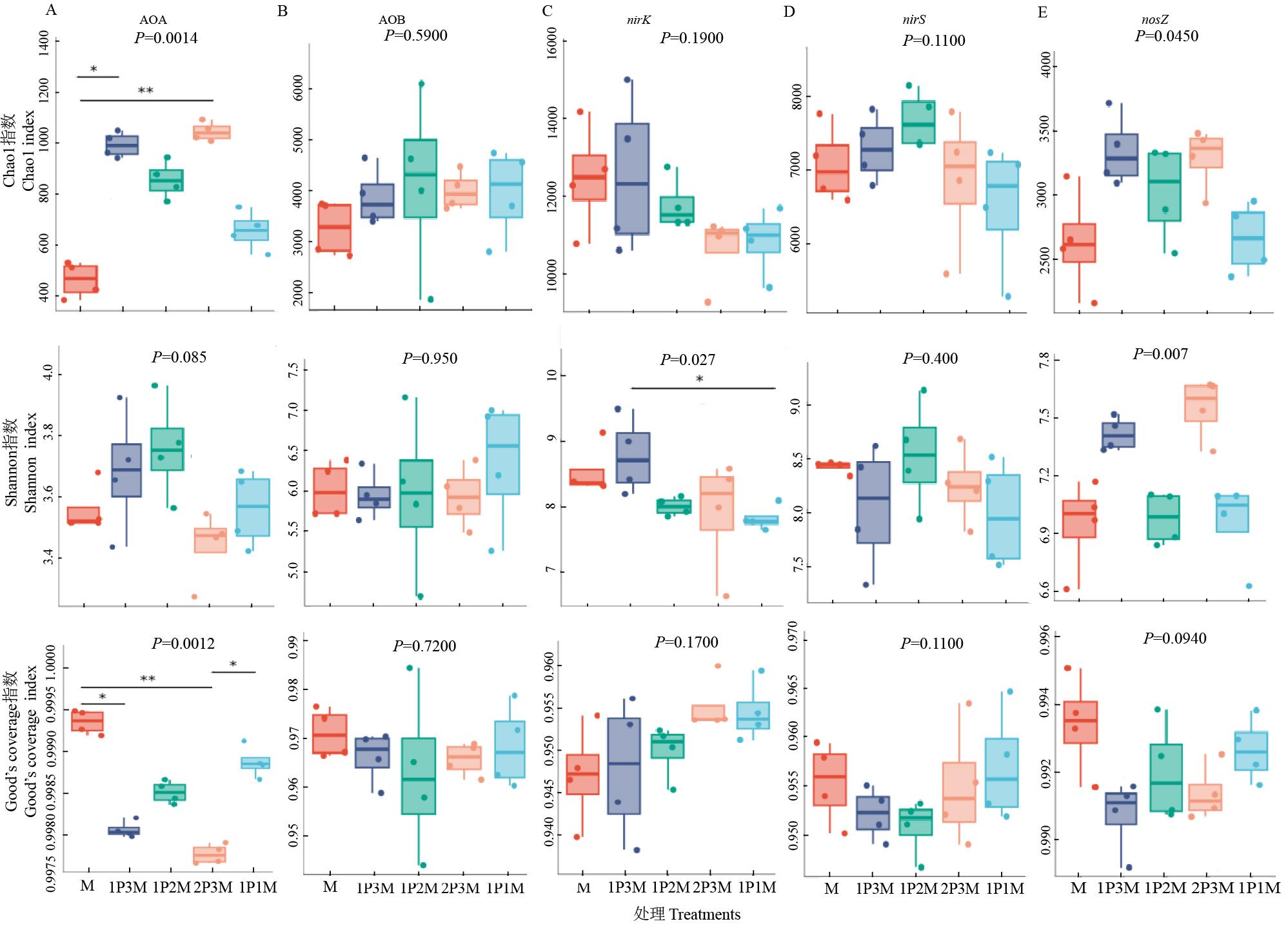 为研究保护播种下糜子种植比例对紫花苜蓿根际土壤因子、氨氧化微生物[氨氧化古菌(ammonia-oxidizing archaea,AOA)和氨氧化细菌(ammonia-oxidizing bacteria,AOB)]和反硝化微生物(nirK、nirS和nosZ)的影响,以黄土高原旱作农业区紫花苜蓿根际土壤为对象,设置4种糜子-紫花苜蓿种植比例[1∶1(1P1M),1∶2(1P2M),1∶3(1P3M)和2∶3(2P3M)]并以紫花苜蓿单播(M)为对照,利用高通量测序分析紫花苜蓿根际土壤中氨氧化和反硝化微生物群落多样性、结构、组成、共现网络及其与土壤因子的相关性。结果表明:随着糜子种植密度的增加,保护播种提高了土壤总氮含量和稳定碳氮同位素值,且在保护播种2P3M中显著增加(P<0.05),土壤有机碳含量先降低后增加,且在2P3M中显著下降(P<0.05)。保护播种提高了土壤氨氧化和nosZ微生物的丰富度,降低了nirK微生物的丰富度,其中,AOA微生物α多样性对种植比例变化更敏感。β多样性分析发现,不同保护播种比例之间,土壤氨氧化和反硝化微生物群落结构差异均不明显。AOA和AOB微生物分别以亚硝化球菌属和亚硝化螺菌属为优势属,其含量均超过85%;而反硝化微生物表现为富集促进植物生长发育和养分转化的菌属,如nirK微生物中无色杆菌属和nirS微生物中固氮弧菌属等。共现网络分析表明,保护播种2P3M处理的土壤氨氧化和反硝化微生物群落具有更复杂的共现网络,主要体现在网络复杂性和模块化系数指标。相关性分析进一步显示,全氮、钙离子、镁离子与AOA微生物多样性显著相关,土壤有机碳和镉离子均与AOB和nirS微生物多样性显著相关。综上所述,饲草与杂粮保护播种会影响饲草根际土壤氨氧化和反硝化微生物多样性、组成和共现网络,揭示了保护播种技术下氮素高效利用的微生物机制,且以2∶3的比例种植作物可能会发挥出保护播种技术最佳优势。