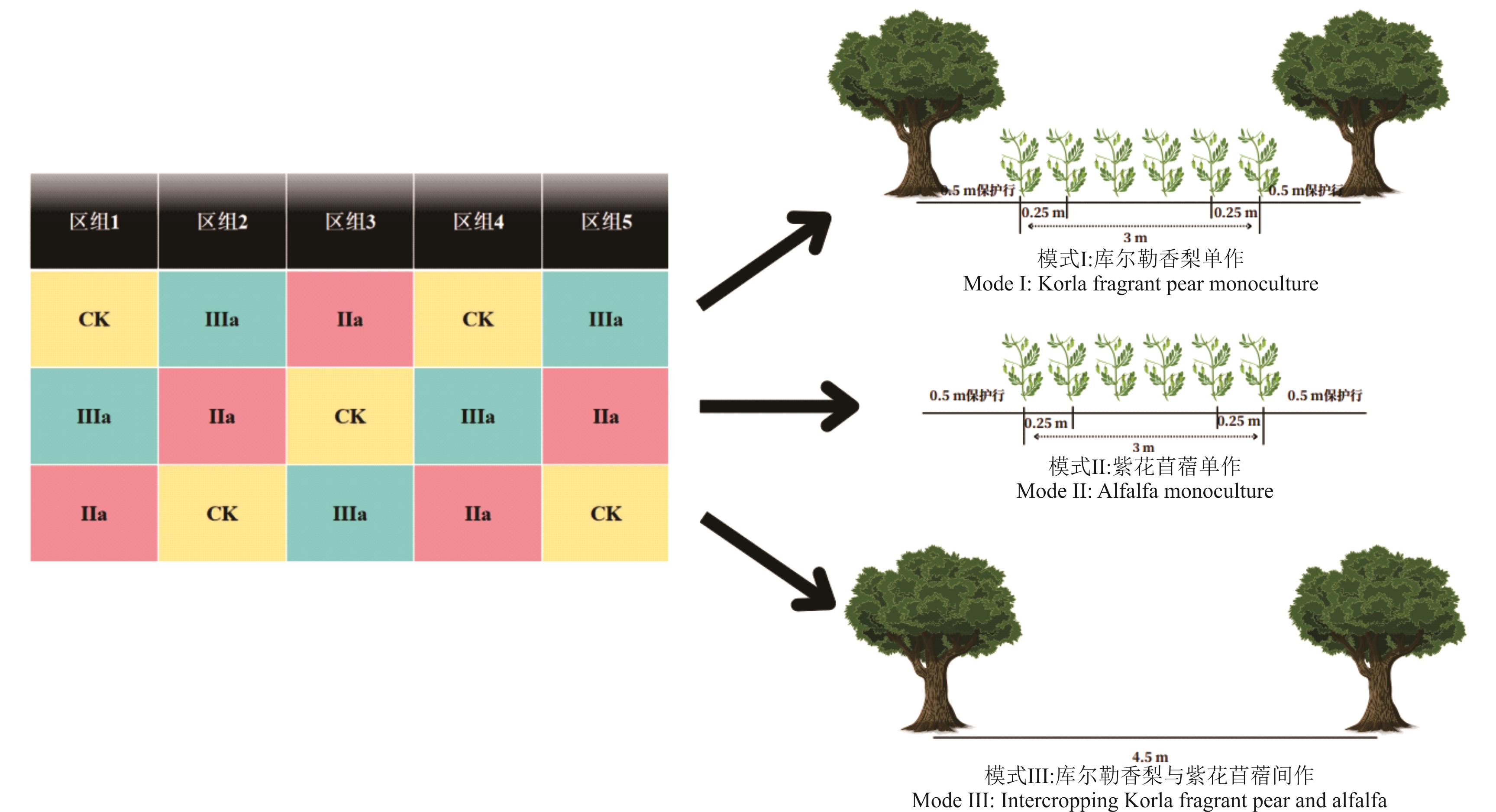 The husbandry methodology of increasing nitrogen supply to Korla pear (Pyrus sinkiangensis) by planting legume forage between rows of Korla pear has been well established, but the specific pathways of nitrogen utilization and transfer under such intercropping are not clear. This study, focused on alfalfa (Medicago sativa) and Korla fragrant pear intercropping. Four nitrogen transfer pathways were established: complete root isolation (PS), inorganic nitrogen ion transfer only (NS), hyphal channel transfer (J), and no isolation (S). The 15N isotope tracing method was used to quantify the biological nitrogen fixation capacity, nitrogen transfer effciency, and influencing factors in the intercropping system, as well as to analyze the contributions of each pathway. The results showed: 1) The nitrogen fixation of intercropped alfalfa was 4.74 g·m-2, which was 0.18 g·m-2, greater than mono-cropped alfalfa. 2) Compared with PS, the amount of nitrogen fixation increased under S increased by 33.6%, increased under NS by 5.4% and decreased under J by 71.7%, while the amount of nitrogen transfer increased by 224.8%, 119.8% and 4.7%, respectively. The nitrogen transfer efficiencies under the four pathways ranked S (0.92%)>NS (0.63%)>J (0.30%)>PS (0.28%). 3) Nitrogen fixing enzyme activity had a highly significant effect on the amount of nitrogen fixation by the leguminous intercrop (P<0.01), while soil hyphal density significantly positively effect on the nitrogen fixation rate (P<0.05) and the intensity and frequency of AM fungal infestation was significantly positively correlated with the rate and amount of nitrogen transfer (P<0.05). Therefore, the nitrogen transfer pathway under intercropping of alfalfa and pear was mainly a dual pathway of inorganic nitrogen ions and AM fungal mycelium, and Korla pear gained a total of 33.61% of its total nitrogen from intercropping with alfalfa. This study offers a novel approach to enhancing nitrogen use efficiency, conserving land resources, and addressing fertilizer shortages in tree-forage tercropping system.