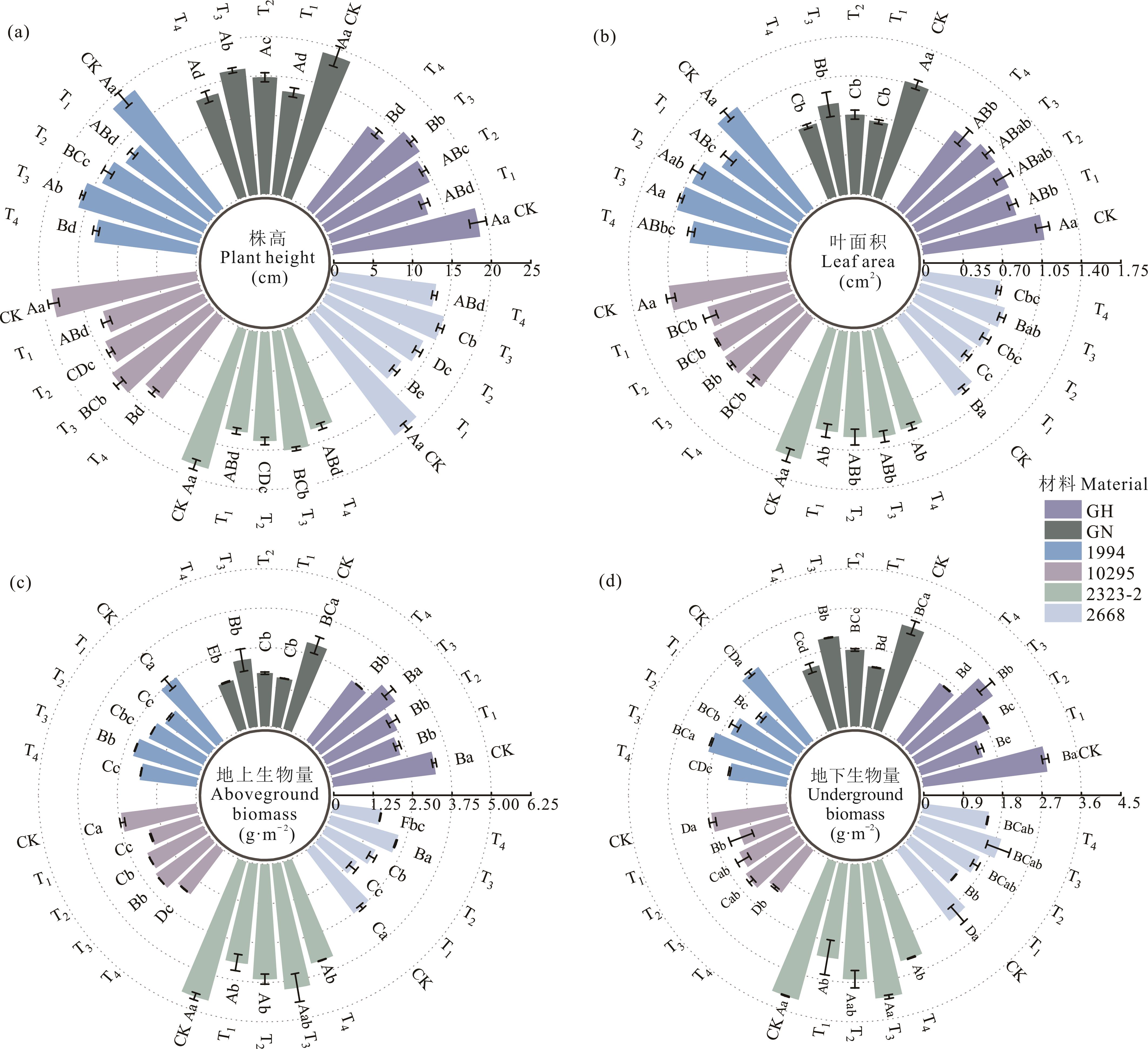 土壤盐渍化是限制植物营养吸收和生长发育的重要因素。红豆草是我国盐碱地区的乡土草种,外源脱落酸(ABA)在提高植物抗逆性方面起着积极的调控作用。为探究外源ABA对盐胁迫下红豆草幼苗生长和生理特性的影响,本试验采用营养液砂培法,在0.8%NaCl处理下,对耐盐(‘GH’、‘GN’、‘1994’)和敏盐(‘10295’、‘2323-2’、‘2668’)红豆草幼苗叶面喷施不同浓度的ABA,即设置1个对照组CK和4个处理组:0.8% NaCl(T1)、0.8% NaCl+0.1 mmol·L-1 ABA(T2)、0.8% NaCl+0.2 mmol·L-1 ABA(T3)、0.8% NaCl+0.3 mmol·L-1 ABA(T4),筛选出缓解盐胁迫的最佳ABA缓释浓度。结果表明:ABA对盐胁迫有缓解效应,能显著提高盐胁迫下红豆草幼苗的株高、叶面积、地上生物量、地下生物量、叶片相对含水量、根系活力、K+含量、叶片与根系赤霉素和玉米素及叶片生长素(IAA)含量,耐盐材料‘GH’的变化较显著,相较于0.8% NaCl处理,T3处理下其株高、叶面积、地上生物量、地下生物量、叶片相对含水量、根系活力、K+含量、叶片与根系赤霉素和玉米素及叶片生长素(IAA)含量分别上升了20.48%、4.63%、26.75%、56.66%、28.19%、65.41%、24.36%、47.55%、36.05%、24.39%、80.53%和19.20%;能降低丙二醛含量、超氧化物歧化酶活性、过氧化物酶活性、过氧化氢酶活性、Na+含量、Ca2+含量、叶片与根系ABA及根系IAA含量,敏盐材料‘10295’变化较不明显,相较于0.8% NaCl处理,T3处理下其丙二醛含量、超氧化物歧化酶活性、过氧化物酶活性、过氧化氢酶活性、Na+含量、Ca2+含量、叶片与根系ABA及根系IAA含量分别下降了14.91%、18.64%、26.15%、10.08%、24.47%、30.24%、8.72%、27.64%和30.87%。研究表明外源ABA可以减弱盐胁迫对细胞的氧化损伤,维持细胞膜系统的完整性和细胞渗透压,并以0.2 mmol·L-1 ABA效果最佳,且耐盐材料对ABA的响应比敏盐材料更显著。